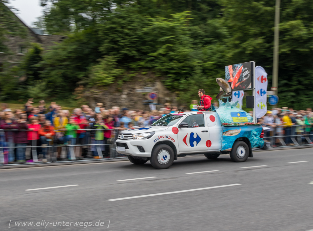Und immer wieder fuhren Fahrzeuge vom Tour de France Orga Team vorbei, ihre Hupen klangen lustig und wieder lachte und jubelte die wartende Menge