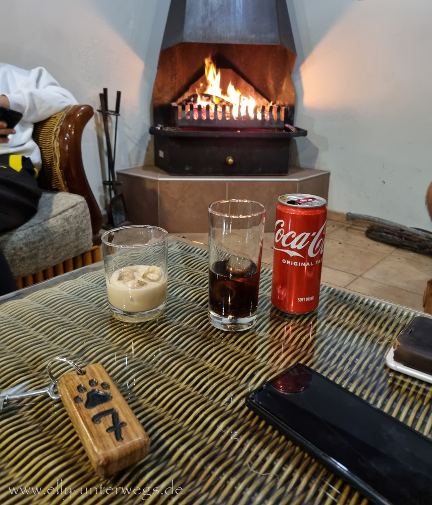 Wir suchten uns in der Bar einen Platz am kuschelig-wärmenden Kaminfeuer und ließen den Tag mit ein paar kühlen Drinks ausklingen.