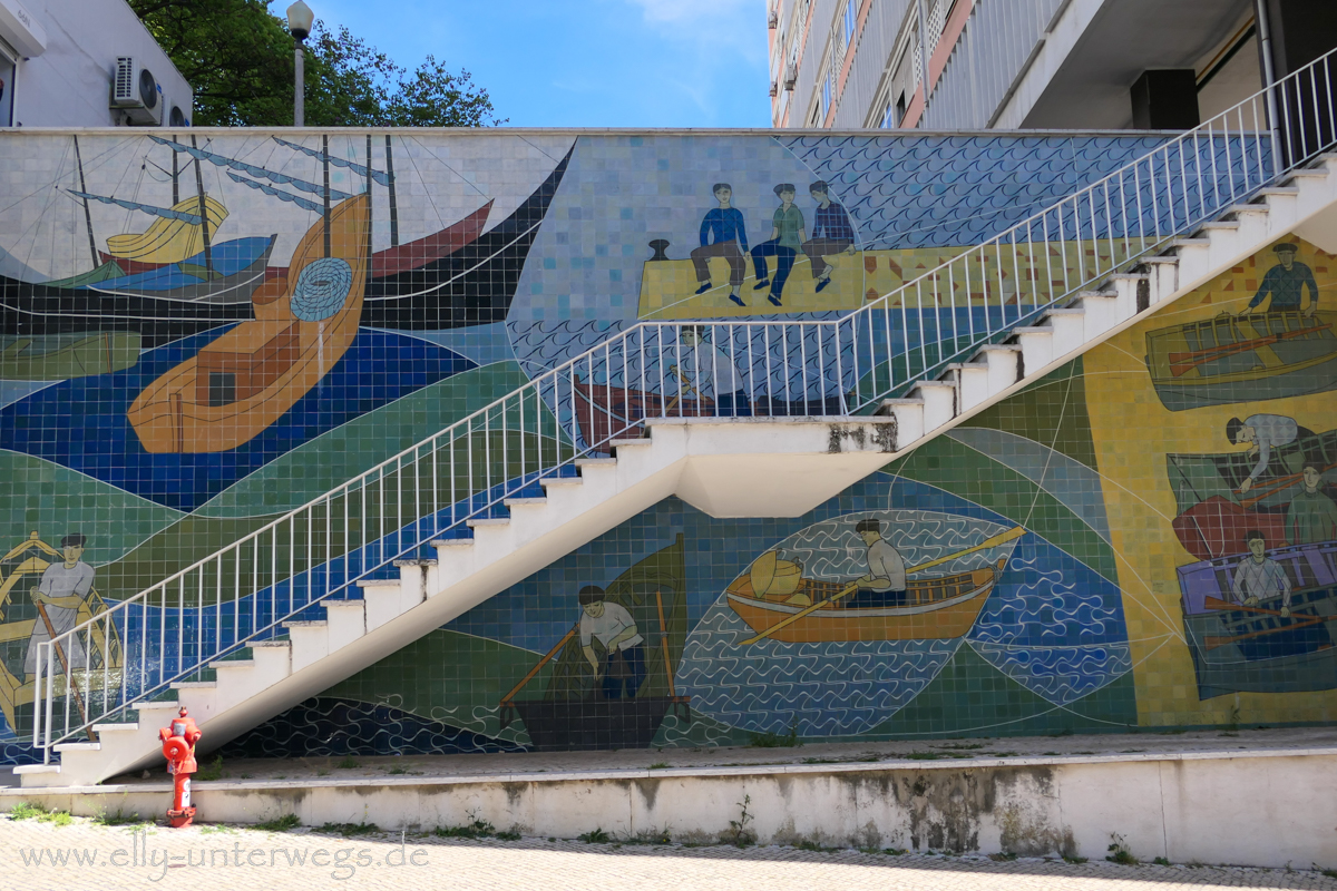 Wir fahren vorbei an vielen Wand-Mosaiken aus Fliesen. Jedes von ihnen erzählt eine für Lissabon wichtige Geschichte. Es geht um Fischer ….