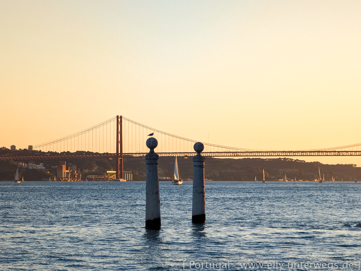 Diese erinnert an die Golden Gate Bridge in San Francisco. Dies ist kein Zufall, denn als die Brücke damals geplant wurde, gab es eine Ausschreibung und man entschied sich für die American Bridge Company. Diese haben damals unter anderem auch die Bay Bridge in San Francisco gebaut, welcher von der Bauart der Brücke in Lissabon, der Ponte 25 de Abril, sehr ähnelt. Also fast baugleich mit der Bay Bridge, die Farbe der Golden Gate Bridge – kein Wunder, dass man an San Francisco erinnert wird.
