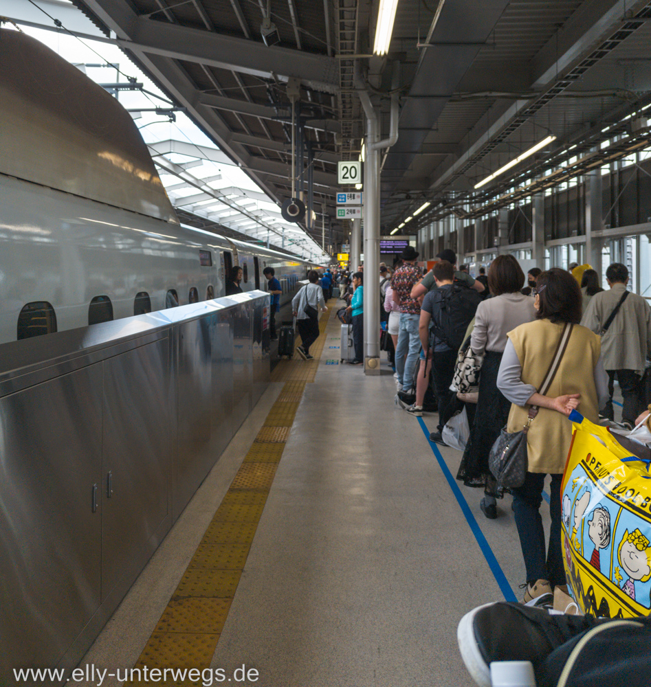 Wenig später saßen wir im Shinkansen. Nicht reservierte Plätze. Wir haben es gewagt und hatten halbwegs Glück. Zusammensitzen konnten wir, Platz für die Koffer gab es aber keinen und so saßen wir wieder etwas eng.