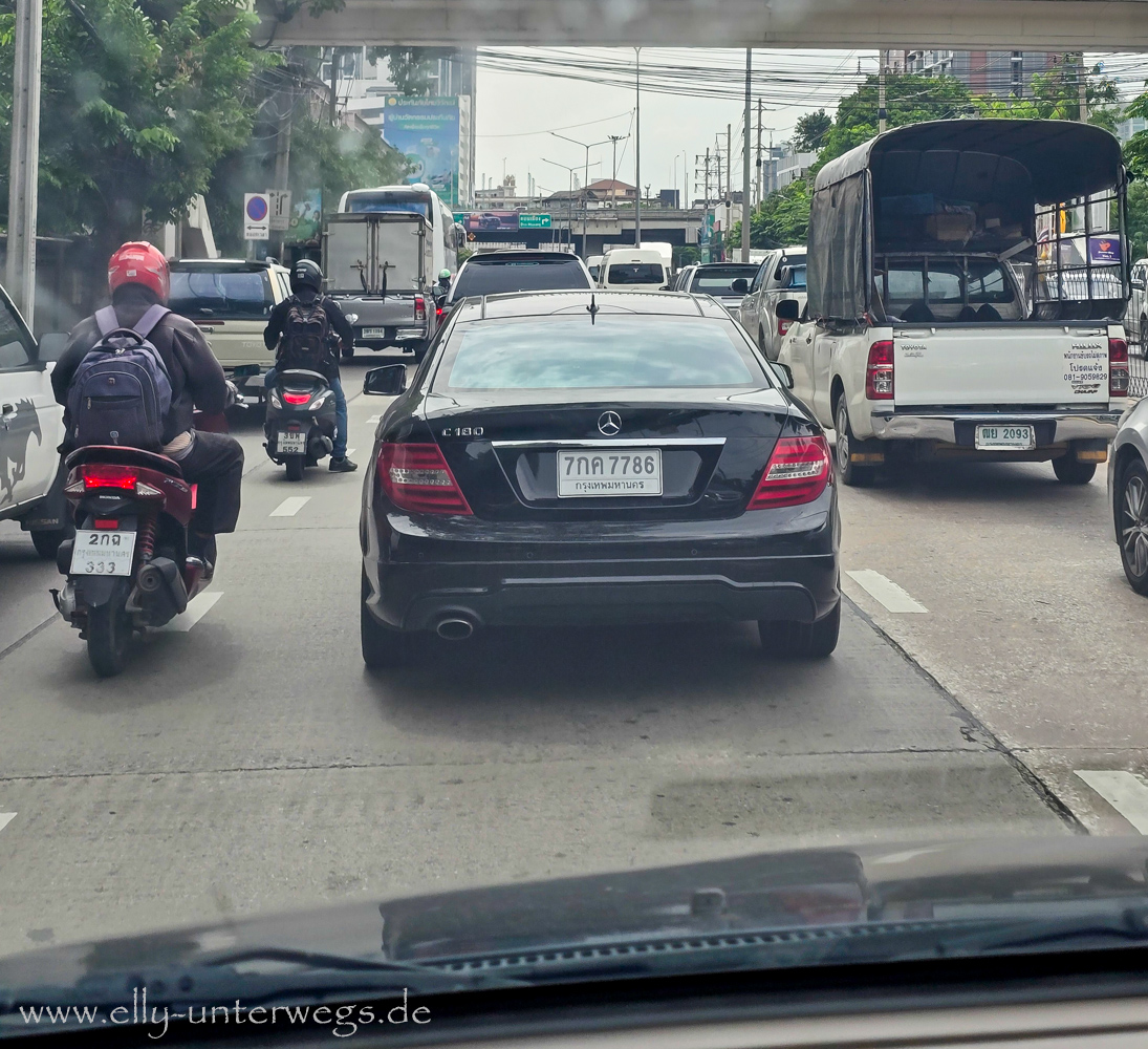 Die Autos drängten sich hupend durch das Verkehrschaos. Roller und Motorräder schlängelten sich zwischen uns hindurch, überholten, wo es ging. Bangkok wanderte direkt in meine Top-3-Liste der Städte, in denen ich niemals selbst Auto fahren möchte.