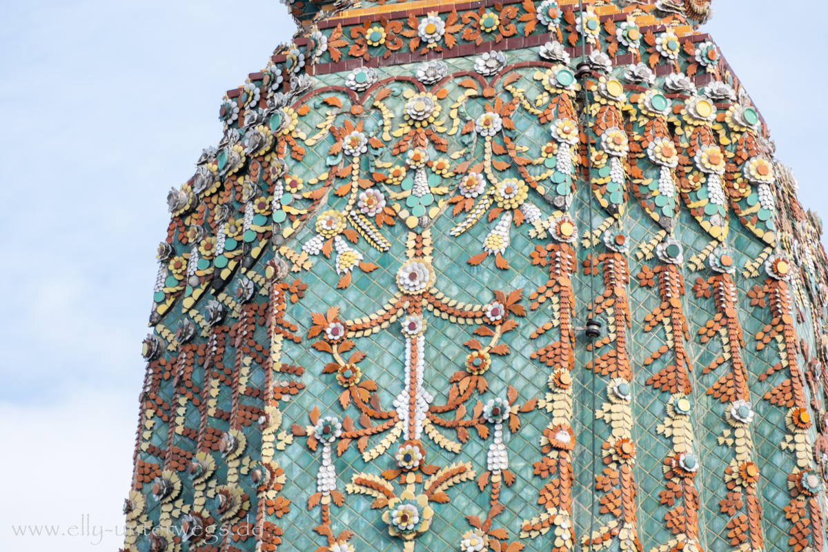 Danach führte Lilli uns zum Königlichen Pantheon Prasad Phra Thepbidon, wo der Smaragd-Buddha ursprünglich aufgestellt werden sollte. Die Kinder und ich waren gleichermaßen fasziniert von den leuchtenden Mosaiken an den Wänden und der Kunstfertigkeit der Handwerker.