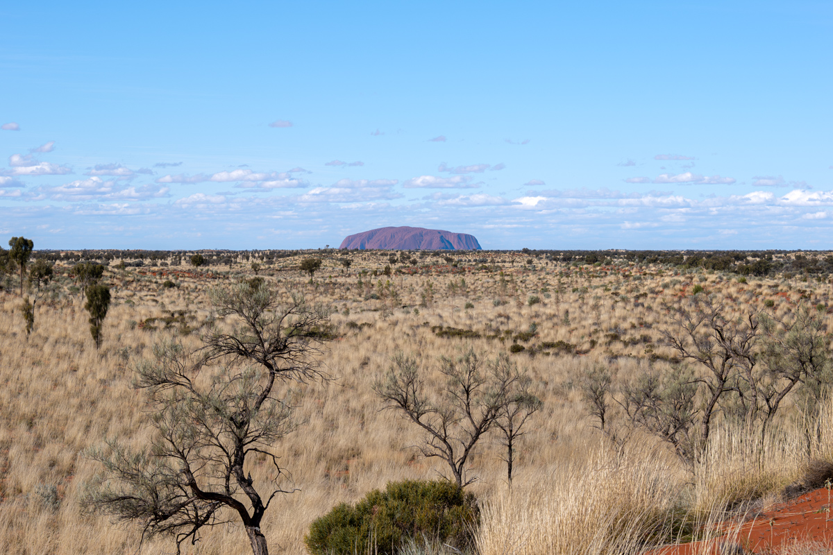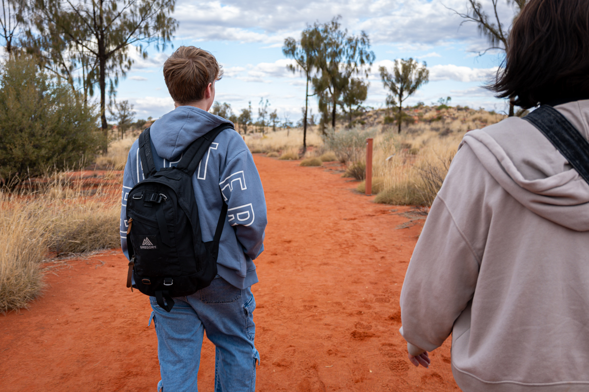 Wir packten den Tagesrucksack und machten uns auf den Weg ins Zentrum des Ayers Rock Resorts. Einmal quer durchs Resort, durch roten Sand, zuerst zu einem kleineren Aussichtspunkt, dann hinauf zum Imalung Lookout – ein kleiner Aussichtshügel mit freiem Blick auf den Uluru.