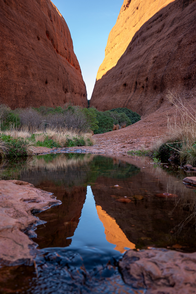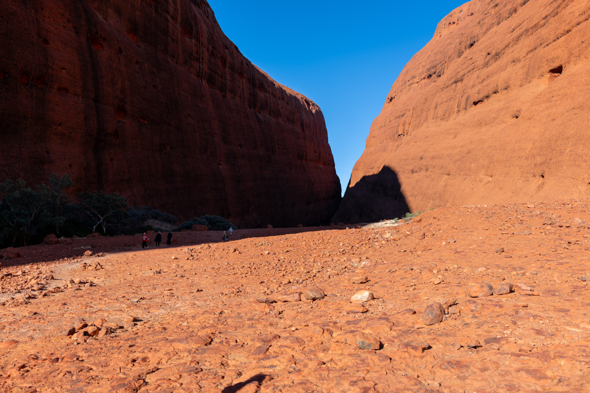 Der Weg führte zwischen den gewaltigen Felskuppeln von Kata Tjuta in die Schlucht hinein. Steile rote Wände links und rechts, wie ein natürlicher Korridor. In der Mitte war ein schmaler Wasserlauf, aktuell kaum mehr als ein Rinnsal, aber erkennbar geformt von früheren Regenfällen. An einigen Stellen wurde aus dem Rinnsal ein kleiner See. Dazwischen überraschend viel Grün – Pflanzen, die sich hier im geschützten Mikroklima halten.