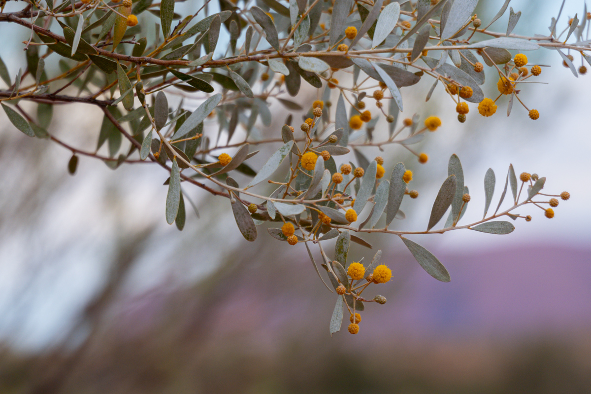 Das sind Blüten einer Akazie (Wattle) – eine typische, in ganz Zentralaustralien häufig vorkommende Wüstenpflanze, deren kugelförmige, gelb blühende Köpfe als Nationalblume Australiens gelten und sich perfekt an Hitze, Trockenheit und nährstoffarme Böden angepasst haben.