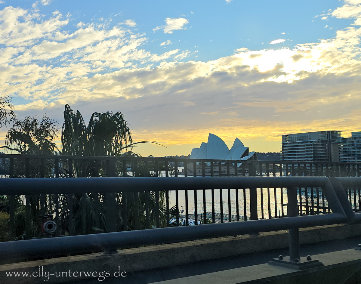 Frühmorgendliches Sydney – noch still, die Sonne schimmerte über den Dächern.