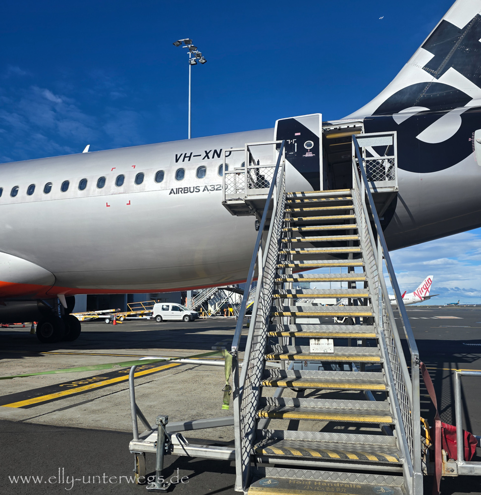 Jetstar ist eine Billig-Airline. Die Bestuhlung war recht eng, selbst ich hatte fast Kniekontakt mit dem Vordersitz . Ich war ausnahmsweise froh, nicht besonders groß zu sein.