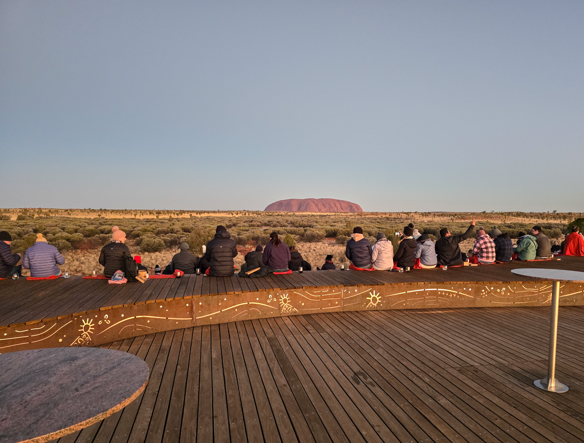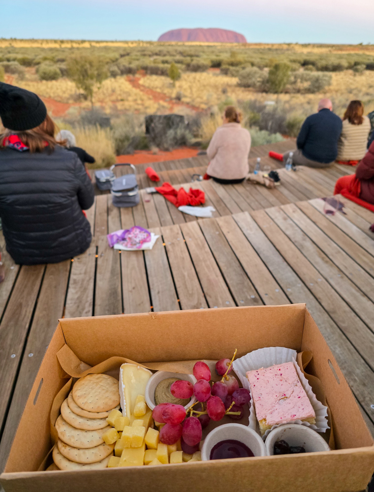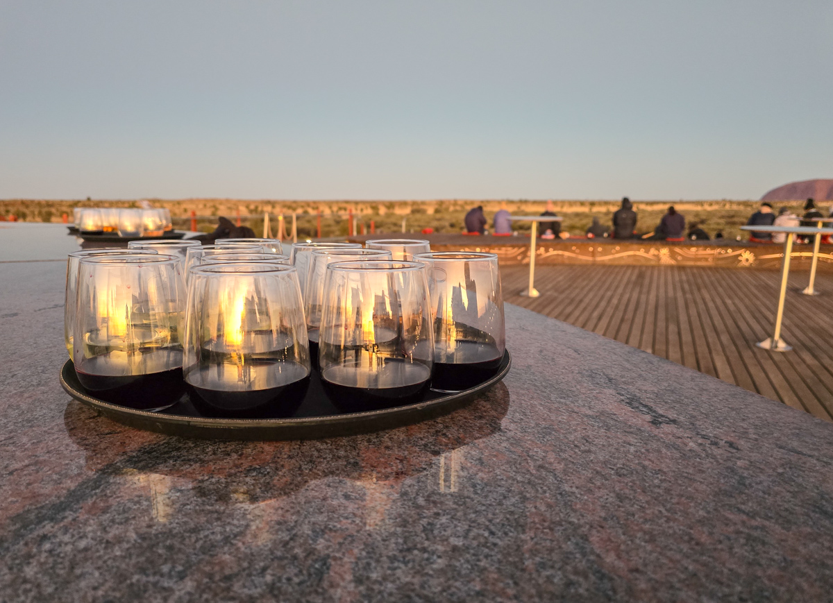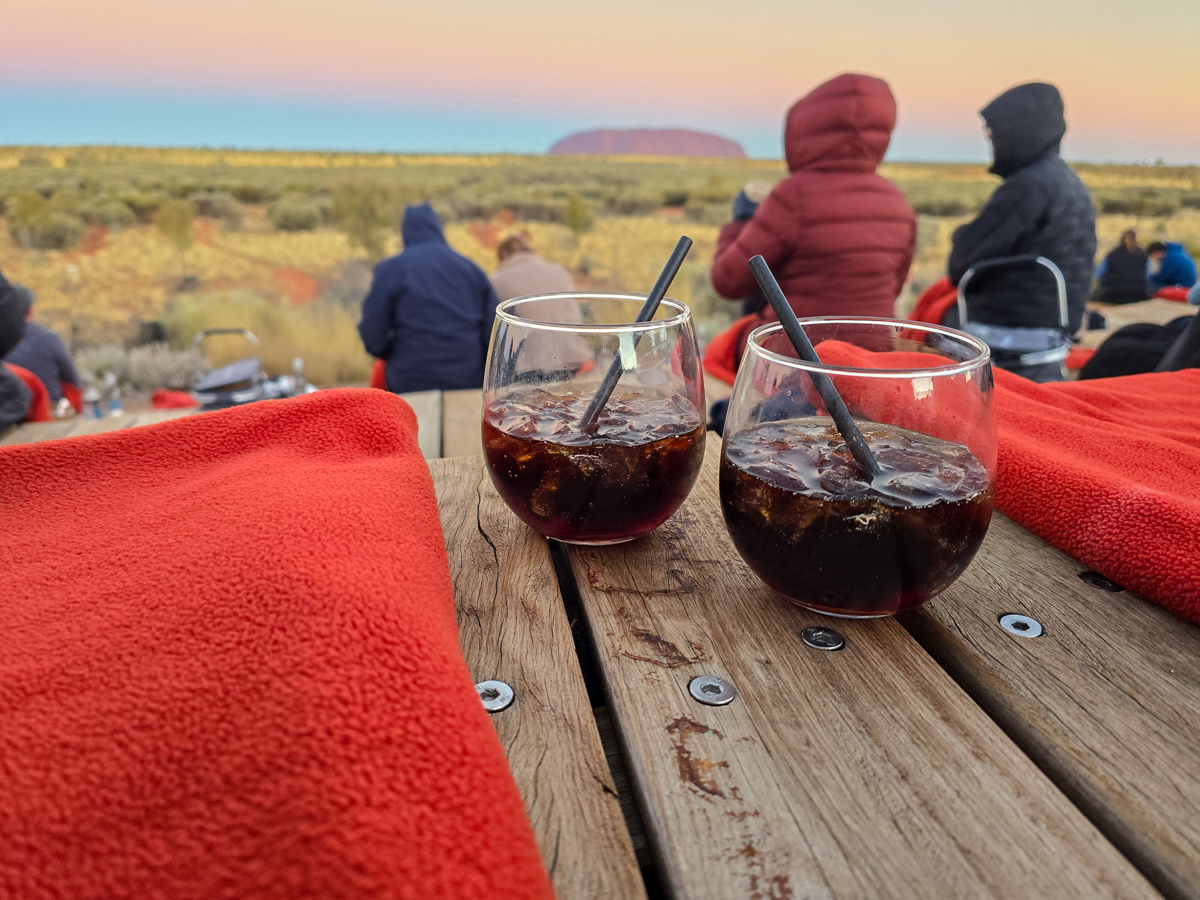 Wir wurden mit dem Shuttle abgeholt – alles war perfekt organisiert. An der Plattform angekommen, wurden uns gleich verschiedene Weine, Softdrinks und Wasser angeboten. Viele Gäste standen an den Stehtischen und genossen den Wein mit Blick auf den Uluru. Ich blieb lieber bei Softdrinks – genauso wie die Zwillinge. Selbst meine volljährige Tochter hatte keine Lust auf Alkohol und entschied sich ebenfalls für ein kühles Getränk.