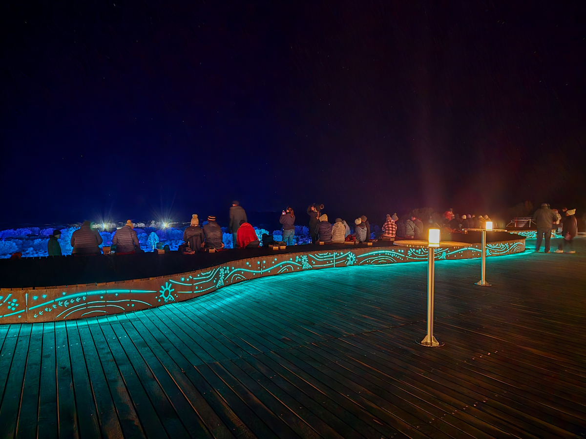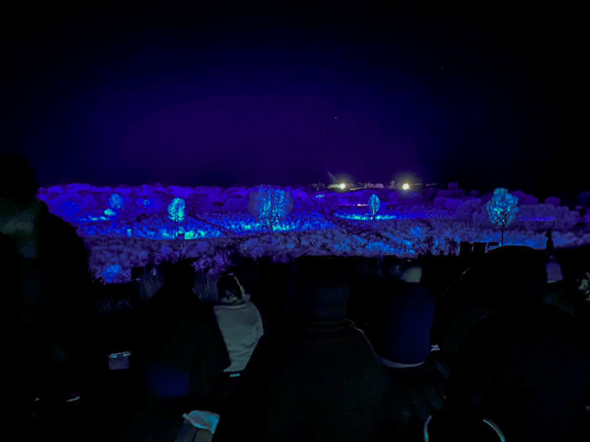 Die Show war schlicht überwältigend. Über 1.100 Drohnen flogen in synchronisierten Formationen, begleitet von Lasern, Lichtprojektionen und traditioneller Musik. Jede Bewegung, jedes Lichtmuster erzählte ein Stück der Mala-Geschichte. Es war mehr als eine Show – es war ein tiefer kultureller Dialog. Man spürte die Verantwortung und die Ehrfurcht, die die Anangu seit Tausenden von Jahren für ihr Land tragen. Die Kombination aus moderner Technologie und jahrtausendealter Tradition ist so wundervoll umgesetzt. Wir lauschten gespannt der Geschichte der Mala und hatten mehrmals Gänsehaut, wenn wieder neue Formen akustisch passend untermalt am Himmel erschienen.