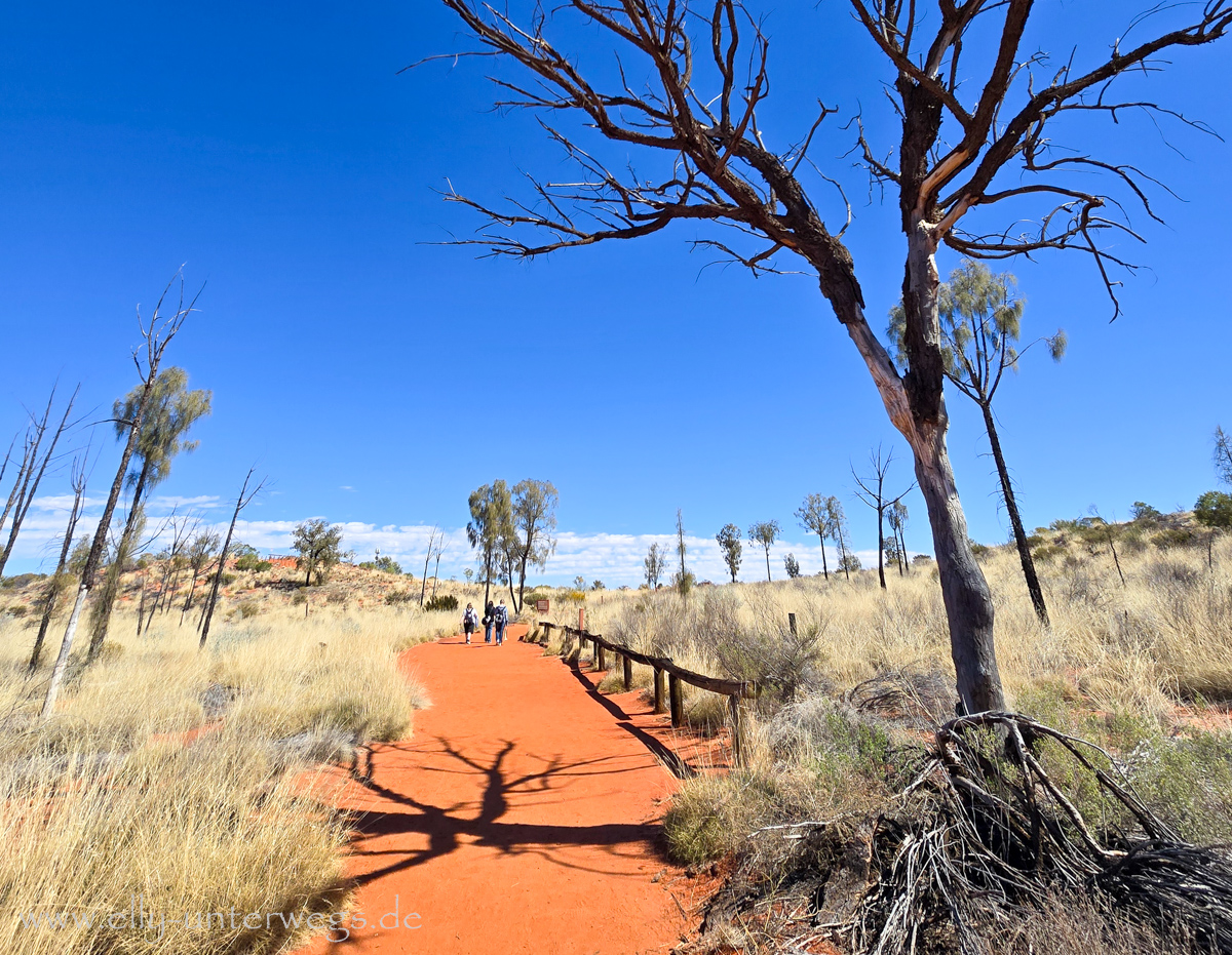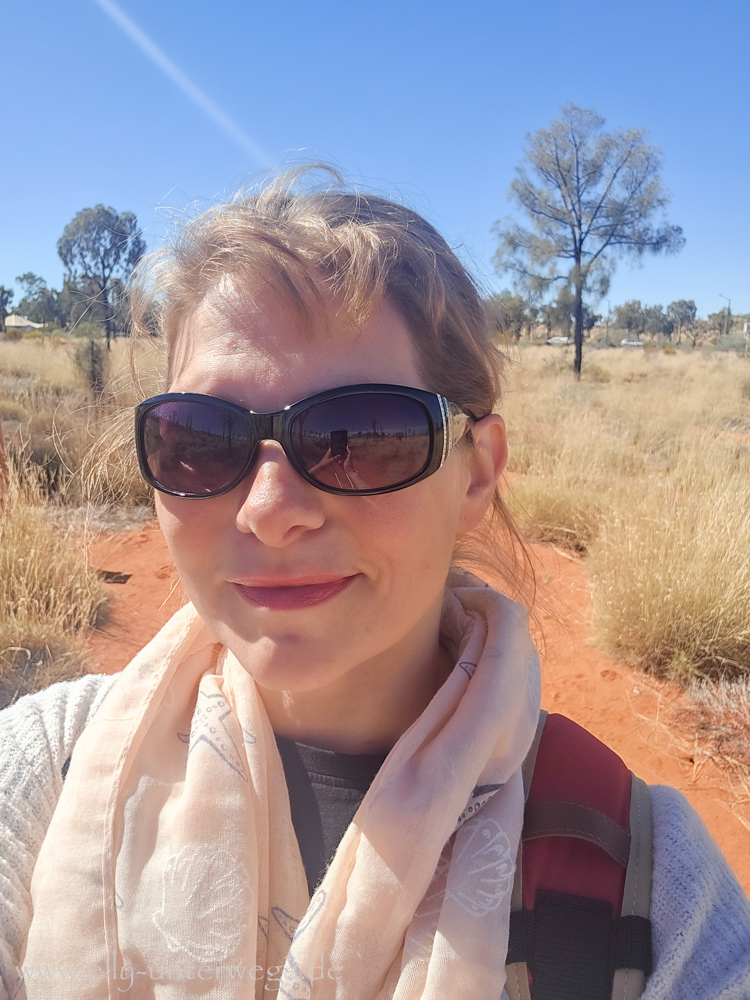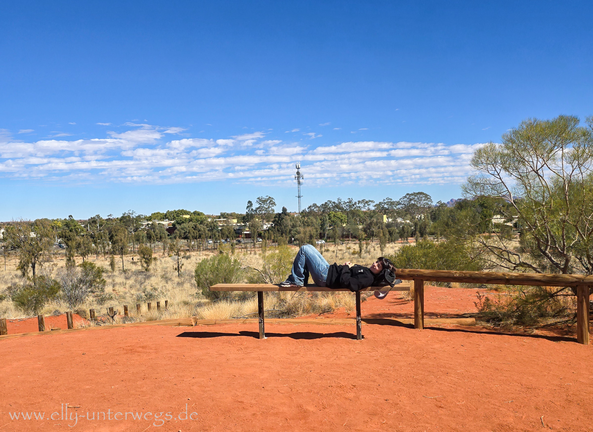 Kurz darauf machten wir noch einen letzten Abstecher zum Imalung Lookout, dem Uluru ‚tschüss‘ sagen. Ich wollte so lange wie möglich dort oben bleiben, den Blick genießen, den ich mir so lange gewünscht hatte. Es war mein Sehnsuchtsort, mein Herzensziel. Deshalb hatten wir ihn auch ganz bewusst am Anfang unserer Reise eingeplant. Wir wollten sicherstellen, dass wir ihn erleben, nachdem wir vor Jahren eine Reise abbrechen mussten und damals so viel unentdeckt geblieben war.