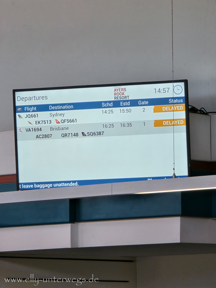 Da wir noch etwas Zeit bis zum Boarding hatten, entschlossen wir uns, das WLAN zu nutzen. Kein Vergleich zum WLAN auf dem Campground – hier funktionierte es wirklich gut. Mein Bruder hatte in den letzten Tagen schon öfter gefragt, ob wir mal wieder einen Videoanruf machen könnten. Inzwischen ist das schon fast eine kleine Tradition geworden: Immer wenn ich in weitweitweg bin, machen wir ein Video-Telefonat, sofern das WLAN es zulässt. Im Airport war sehr gutes WLAN. Fast keine Verzögerung, die Verbindung war klar. Schon crazy. Ich stand im Terminal, am anderen Ende der Welt, sah meinen Bruder gestochen scharf auf dem Handy und wir zeigten uns, was um uns herum geschah. In der Ferne konnte man sogar die obere Kante vom Uluru erkennen. Ja, eigentlich nix besonderes. Aber mich bzw. uns fasziniert diese Technik trotzdem immer wieder aufs Neue.