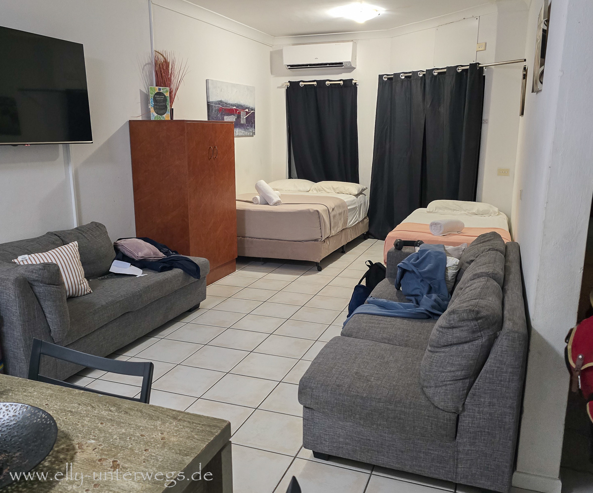 Mit dem Uber fuhren wir in nur sieben Minuten zur Unterkunft. Der Self-Check-in per Code funktionierte reibungslos, die Koffer abgestellt, schnell abgeduscht, und dann waren wir einfach nur müde.