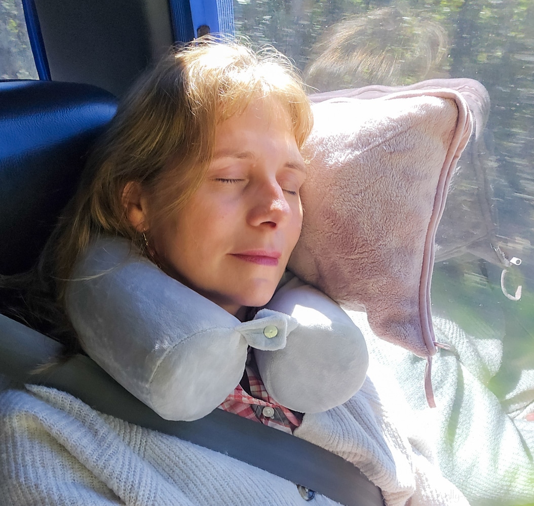 Ein Symbolfoto. Soll zeigen, dass man mit Kissen und Nackenhörnchen gut schlafen kann, sogar besser als in der Flugzeug-Holzklasse. Ich habe tatsächlich bei jeder Fahrt eine Runde geschlafen.